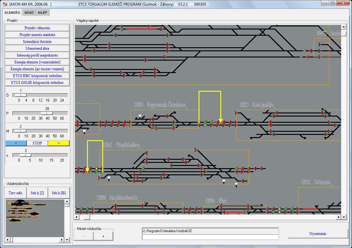 Vonat szimulátor: Egy program, mely képes egy vonat valósághű mozgatására, figyelembe véve a fizikai törvényszerűségeket, úgymint: lejtők, ívek, fékszázalék, vonóerő diagram, stb.